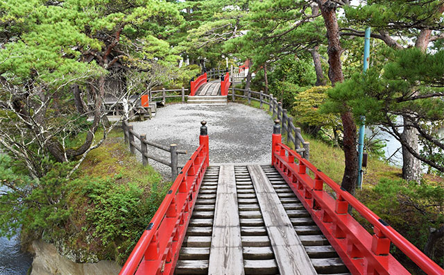遊覧船乗り場から「松島レトロ館」方面へ進むと、朱塗りの橋が見えます。全長約252mの橋を渡った先の小さな島が「福浦島」です。