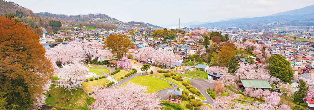 かつて、上山城の発展を支えた「かみのやま温泉」。現在では城下町の賑やかさを残しながら、都会の喧噪を離れた温泉地として、多くの観光客が訪れています。蔵王連峰を臨む絶景やのどかな里山風景などの景色が見られ、上山市内ではのんびりと観光地めぐりを楽しめます。