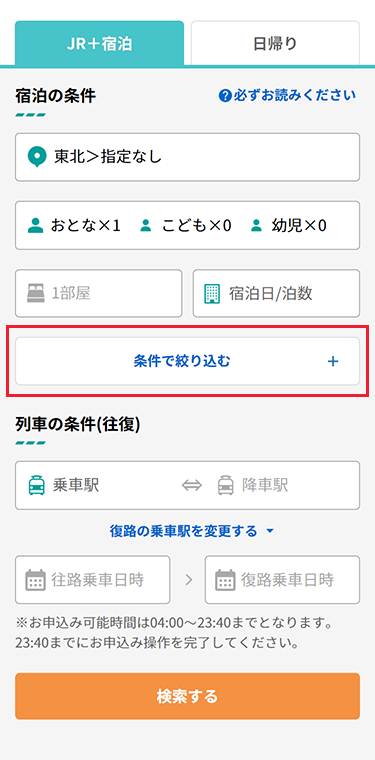 部屋タイプ(シングル・ツインなど)、禁煙 / 喫煙 、食事タイプ(朝食付・夕食付など)のご希望がある場合は「条件で絞り込む」で設定します。